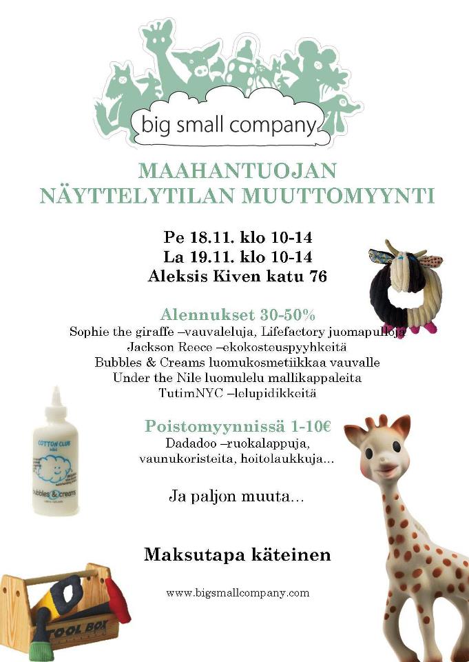20.10.11Hoksasin facebookissa tällaisen ilmoituksen, mikä saattaa kiinnostaa useitakin. Nyt olisi nimittäin Sofia kirahvia kamuineen muuttomyynnissä. Mukana myös tosi hyvät Jackson Reese ekokosteuspyyhkeet ja Bubbles&Creamsin luomukosmetiikkaa. En haluaisi sanoa tätä vielä, mutta kyllähän se joulu lähestyy.